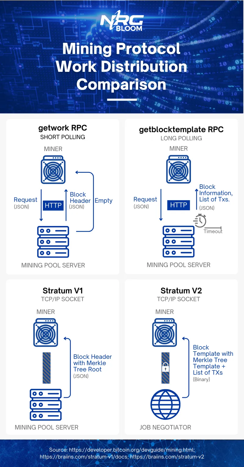 Despite these advantages, direct adoption of the getblocktemplate protocol faced challenges, particularly due to the concurrent release of Stratum V1 around the same time.