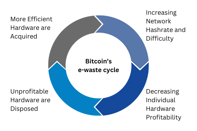 A 2021 study estimated the e-waste generated by Bitcoin mining, calculating the average lifespan of ASIC miners at 1.29 years, based on factors like network hash rate, mining hardware efficiency, and profitability at electricity costs of 5 cents/kWh.