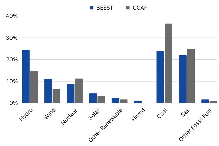 Daniel Batten introduced an alternative model, BEEST (Bitcoin Energy & Emissions Sustainability Tracker), to address the shortcomings of the CCAF model. BEEST considers several critical elements overlooked by CCAF, notably two key areas: ERCOT's (Electric Reliability Council of Texas) role and off-grid mining operations. These factors are substantial, representing 24.99% and 27.9% of total Bitcoin mining operations, summing up to 52.89%. BEEST's analysis estimates that off-grid operations use an energy mix of 81% low-emission sources (renewables and nuclear) and 19% fossil fuels(7). ERCOT's energy sources, as per their website, comprise 47.7% low-emission and 52.3% fossil fuel sources(8).