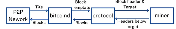 Upon being transmitted to numerous nodes for validation, verified transactions will eventually make their way to Bitcoin miners ("mining nodes") through mining protocols: “getwork” protocol for solo mining(52) and Stratum for pool mining. These protocols communicate with miners by sending a block header, along with the target hash(51). Miners will then undertake the task of validating their candidate block.