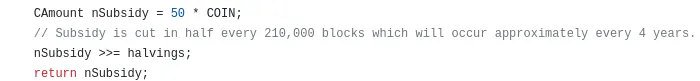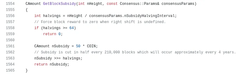 The next line of code is where the current halving is taken into account to calculate the block subsidy. The “>>=” element, also called “bitwise right shift”, is a C++ element that drops a defined amount of elements at the end of the binary number.