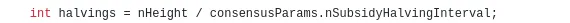 The initial line of code within the function defines an integer variable named "halvings." Essentially, this variable holds a whole number, rounded down to its nearest integer value. Its value is determined through a calculation involving "nHeight," representing the number of blocks already mined, divided by a parameter established in the consensus rules.