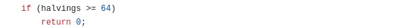For instance, consider the scenario when this post was composed, with a total of 806,005 blocks mined. The calculation would appear as follows: int halvings = 806005/210000, resulting in a value of 3.838119048. However, to conform to the requirement of being an integer, "halvings" is rounded down to 3.