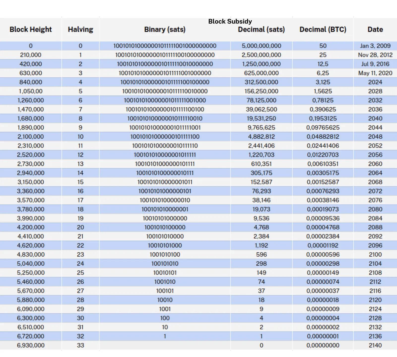 Given that the binary number representing 50 bitcoins contains only 33 elements, or bits, there's a finite capacity for halvings, 33 to be precise. Once these 33 halvings occur, the last bit will be dropped, signifying the cessation of the block subsidy. This event is estimated to transpire around August 1, 2137(24). It's this finite nature of halvings that contributes to Bitcoin's hard cap of 21 million coins.