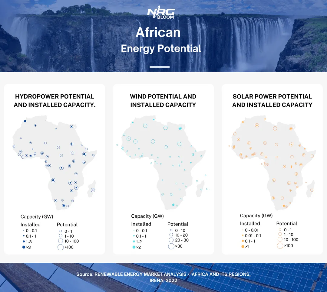 Furthermore, while Africa shines with potential for renewable energy sources such as solar, wind, and hydropower, these remain less exploited than in other continents. The bounteous renewable energy promise of the continent faces financial, technical, and bureaucratic challenges. To put things into perspective, a mere 5% of Africa's rich hydropower resources have been harnessed till date(3).